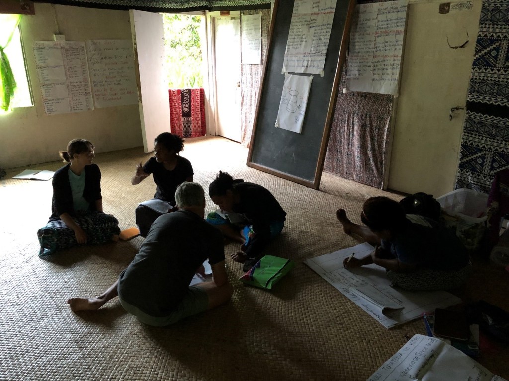 Elodie Fache, Simonne Pauwels and Mere Veitayaki spent one month on Cicia from the 24th of September until the 22nd of October 2019. Cicia has been chosen as a research site for SOCPacific as it is the first certified organic island in the South Pacific, and it therefore represents a particularly interesting case study in terms of the ridge-to-reef management approach. The team members organized individual and group talanoa (discussion) sessions about several topics, such as local fishing methods, the connections between local fisheries management and organic farming efforts, culturally significant fishes, virgin coconut oil production, daily life, and changes since the settlement on the island. In addition, they organized drawing sessions in two primary schools, Cicia District School and Mabula District School, following the transdisciplinary protocol mentioned below. The activity involved children from Class 5 to Class 8, and some preliminary findings of the comparative study of children’s views of the sea and the resources therein were given to the students afterwards. In parallel, the team immediately responded to the invitation of the principal of the island’s high school (Cicia High School) to give two presentations focused on the work and personal experiences of being a researcher. We are deeply grateful for the welcome the team has received on Cicia, and for being allowed to learn a lot.
