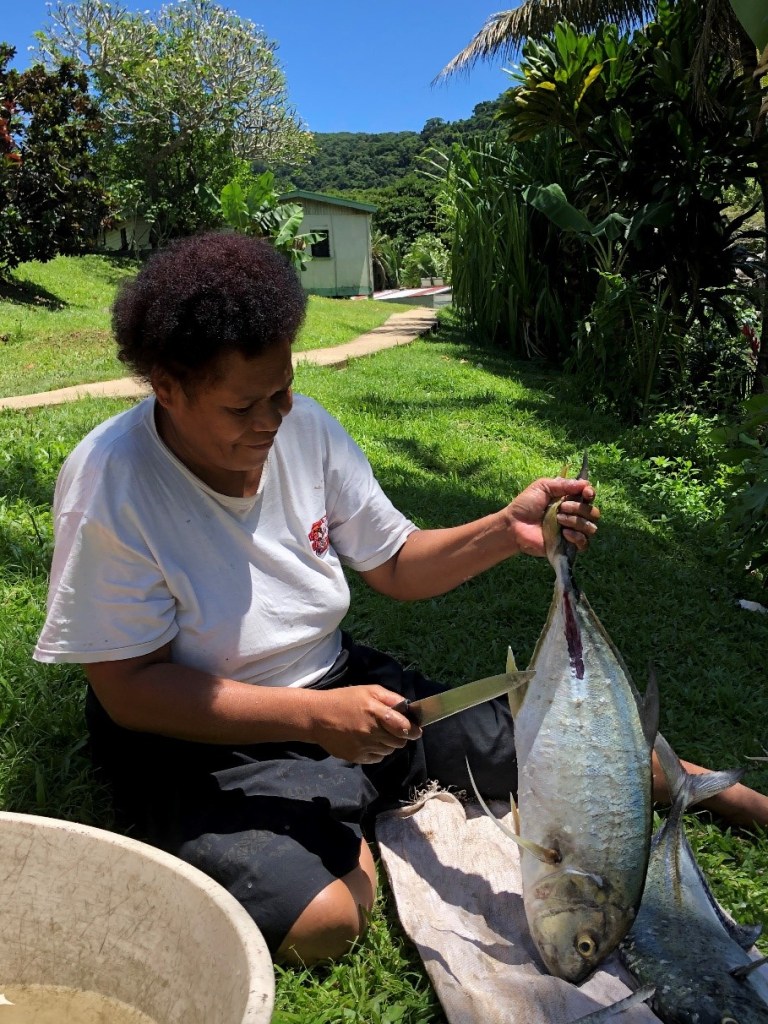 Elodie and Annette, often accompanied by Ulamila, conducted qualitative interviews and observations in Matasawalevu (in direct proximity of the Naiqoro Passage Spawning Aggregation Marine Reserve, established in November 2018) and Kavala (in the same bay as the Fisheries station, as well as where the ferry from the capital arrives twice a week). These were in the format of talanoa sessions with various community members in both formal and informal settings, with the least disruption to their planned events and daily activities (e.g., while preparing fish). The interviews covered several topics, such as local fishing methods, the connections between local fisheries management and culturally significant fishes, and changes since the establishment of this gazetted marine protected area. The IMR team visited 12 villages in Nakasaleka District (Matasawalevu, Nukuvou, Vacalea, Tiliva, Lavidi, Kavala, Solotavui, Lawaki, Lomanikoro, Nakaugasele, Nakaunakoro, Nakoronawa) and a few settlements for the MRV survey, based on questionnaires about fishing and gleaning activities.
