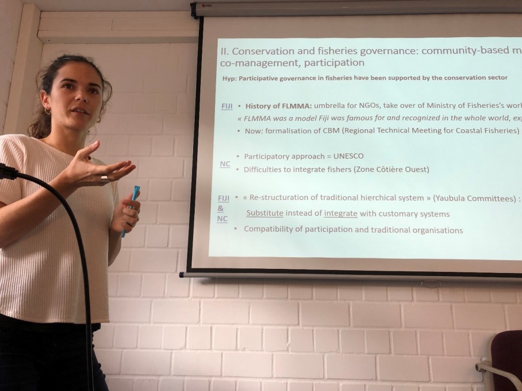 After her first field work phase of 3 months in Fiji and 4 months in New Caledonia, Léa will return to Montpellier in December to start her data analysis and prepare her next field work period (April-June 2020). During this time in the two countries, she has questioned the integration of conservation measures such as the protection of marine species and marine spaces in coastal fisheries management schemes. The modalities of collaborations between stakeholders from the conservation sector (international NGOs, donors, local associations, eco-tourism operators) and fisheries sectors (fishers, federations and managers) and their evolutions were investigated through interviews and observations. Léa also explored the influence of regional organisations and multilateral agreements on the design and implementation of local management policies related to coastal fisheries.
